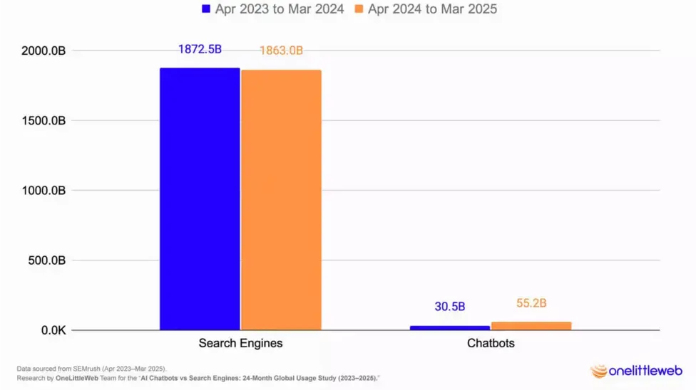 A report from the first quarter of 2025 showed that while traditional search traffic declined slightly (by 0.5%), traffic from LLMs increased by 80%. In absolute terms, search engines still dominate, with Google approaching 2 trillion visits. But LLM traffic grew from 30 billion to 55 billion visits, placing it alongside major web platforms in scale.